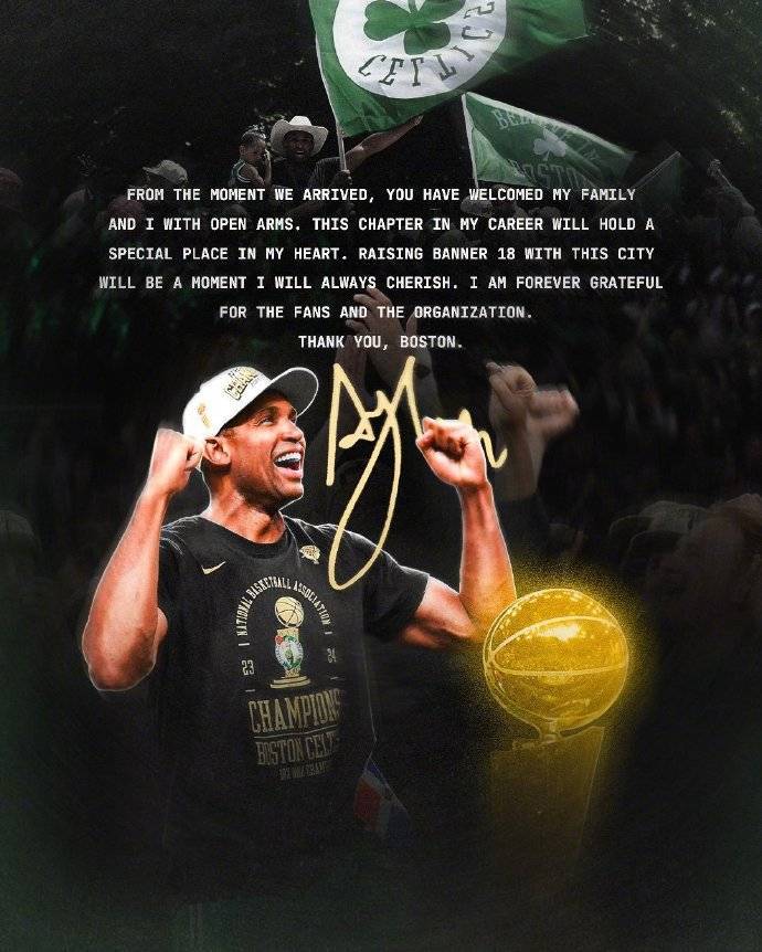 今日,霍福德更新社媒致谢了凯尔特人:“自我们抵达之日起,你们就以无比的热情欢迎了我和我的家人们。这段职业生涯的经历将永远在我心中占据一个特殊的位置。与这座城市一起升起第18面总冠军旗帜将是我此生永远铭记的一刻。我将永远感激球队和球迷们。谢谢你们,波士顿。”